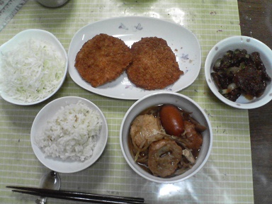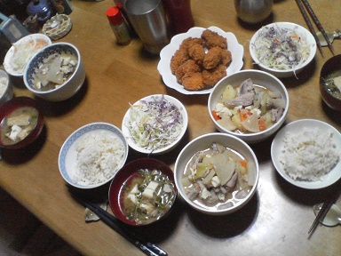 今日は揚物などを頂きます。一口カツ?豚レバーも頂きます。味噌汁代わりに鍋の余り物?キャベツサラダも頂きます。今日もおいしく頂きました。