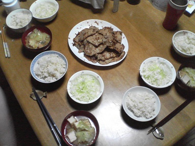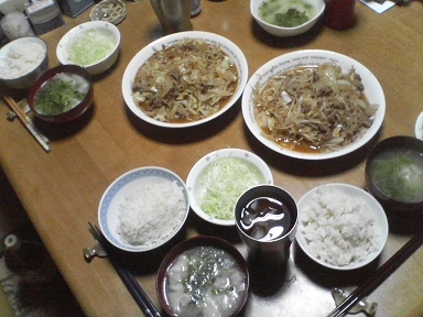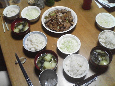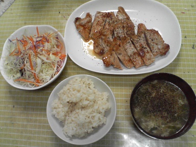 今日は豚肉などを頂きます。フライパンにオリーブ油を入れ、豚肉を焼きます。市販の生姜焼きのタレを加えます。完成。味噌汁はキャベツと揚豆腐・・キャベツサラダも頂きます。今日もおいしく頂きました。