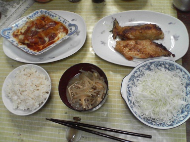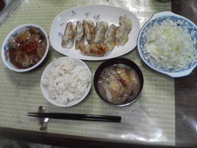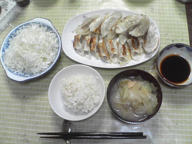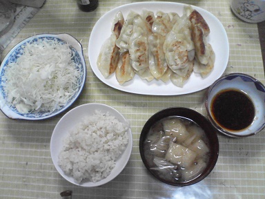 今日は餃子などを頂きます。普通の餃子・・鶏大根も頂きます。味噌汁はシメジとあぶらげ・・キャベツサラダも頂きます。今日もおいしく頂きました。