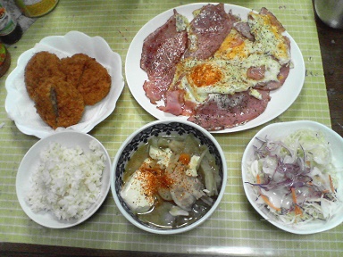 今日はベーコンエッグなどを頂きます。フライパンにオリーブ油を入れ、ベーコンと卵を焼きます。完成。コロッケも頂きます。豚汁も・・キャベツサラダも頂きます。今日もおいしく頂きました。