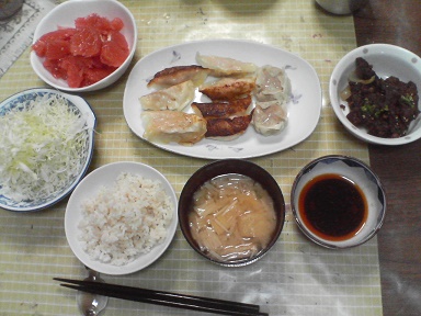 今日は餃子などを頂きます。餃子と焼売も?豚レバーの甘辛揚げも頂きます。味噌汁はエノキとあぶらげ・・キャベツサラダも頂きます。グレープフルーツも・・今日もおいしく頂きました。