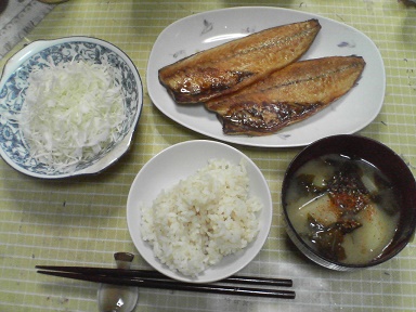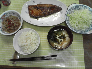 今日は鯖などを頂きます。フライパンにオリーブ油を入れ、塩鯖を焼きます。完成。味噌汁は豆腐とワカメ・・キャベツサラダも頂きます。今日もおいしく頂きました。