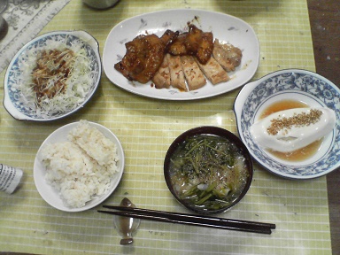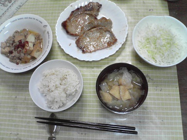 今日は豚肉などを頂きます。フライパンにオリーブ油を入れ、豚肉を焼きます。完成。肉豆腐も頂きます。味噌汁はキャベツとあぶらげ・・キャベツサラダも頂きます。今日もおいしく頂きました。