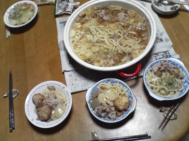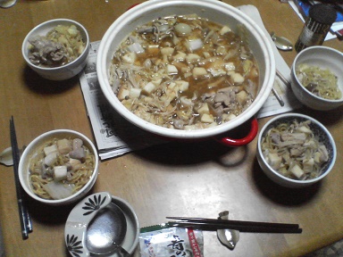 今日は鍋うどんなどを頂きます。鍋にダシを入れ、豚肉、白菜、モヤシ、豆腐などを煮込みます。火が通ったらダシ醤油、味醂などで味付けし、油麩、うどんなどを加えます。しばらく煮込んで完成。各自取り分けて頂きます。今日もおいしく頂きました。