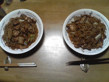 今日は焼きそばなどを頂きます。フライパンにオリーブ油を入れ、豚肉から炒めます。モヤシを加えます。麺とソースを加えて炒めます。塩味・・完成。今日もおいしく頂きました。