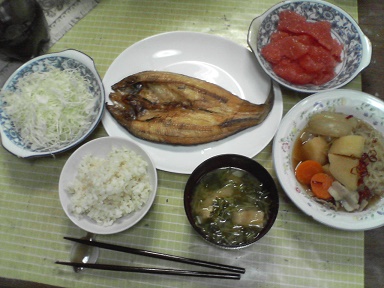 今日はホッケなどを頂きます。フライパンにオリーブ油を入れ、ホッケの開きを焼きます。じっくり焼いて完成。肉じゃがも頂きます。味噌汁は豆苗とあぶらげ・・キャベツサラダも頂きます。グレープフルーツも・・今日もおいしく頂きました。