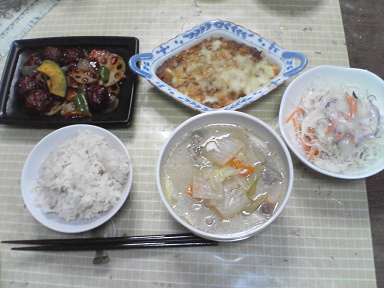 今日は豚汁などを頂きます。普通の豚汁?グラタンも頂きます。肉団子などの市販のおかず・・キャベツサラダも頂きます。今日もおいしく頂きました。
