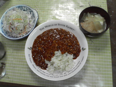 今日はカレーなどを頂きます。キーマカレー?味噌汁は大根と揚豆腐・・キャベツサラダも頂きます。今日もおいしく頂きました。