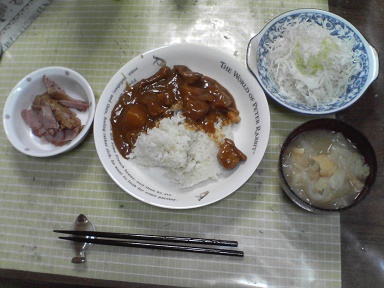 今日はカレーなどを頂きます。普通のポークカレー・・チャーシューとメンマのおつまみ?味噌汁はキャベツとあぶらげ・・キャベツサラダも頂きます。今日もおいしく頂きました。