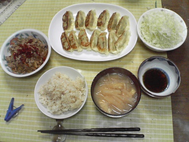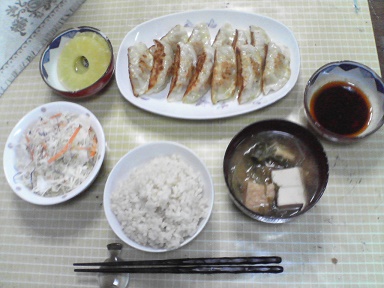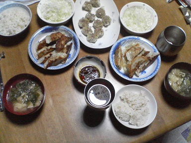 今日は餃子などを頂きます。普通の餃子?焼売も頂きます。味噌汁は水菜とあぶらげ・・キャベツサラダも頂きます。今日もおいしく頂きました。