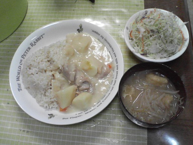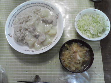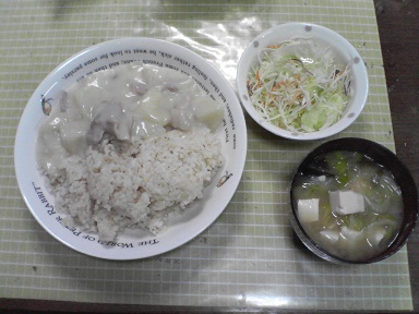 今日はシチューなどを頂きます。普通のシチュー?味噌汁はモヤシとあぶらげ・・キャベツサラダも頂きます。今日もおいしく頂きました。