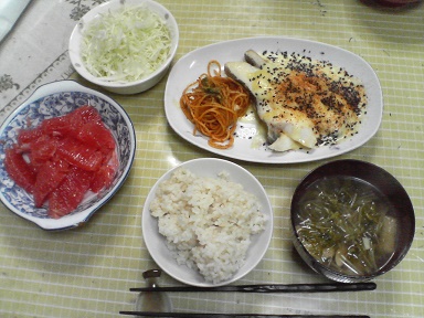 今日は鱈などを頂きます。鱈のチーズ掛け、付け合わせはパスタ?味噌汁は豆苗とあぶらげ・・キャベツサラダも頂きます。グレープフルーツも・・今日もおいしく頂きました。