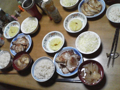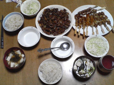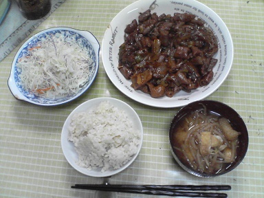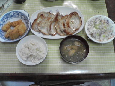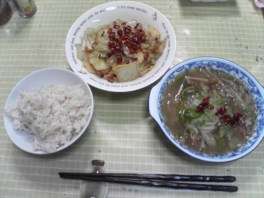 今日は餃子などを頂きます。普通の餃子・・春雨と挽肉の炒め物?味噌汁は大根とあぶらげ・・キャベツサラダも頂きます。今日もおいしく頂きました。