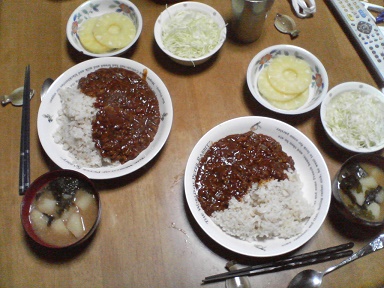 今日はカレーなどを頂きます。キーマカレー?味噌汁はジャガイモとワカメ・・キャベツサラダも頂きます。缶詰のパイナップル・・今日もおいしく頂きました。