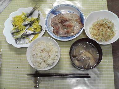 今日は豚肉などを頂きます。豚肉のオリーブ油焼き・・こはだも頂きます。味噌汁はシメジとあぶらげ・・サラダも頂きます。今日もおいしく頂きました。