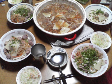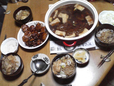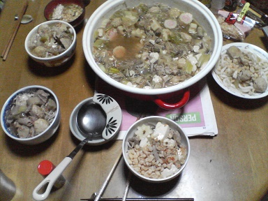 今日は鍋物などを頂きます。塩味ベースに小エビのダシでエビ塩風味?鶏団子、長葱、豆腐、モヤシ、豚ホルモンなどを煮込みます。各自好みで頂きます。今日もおいしく頂きました。