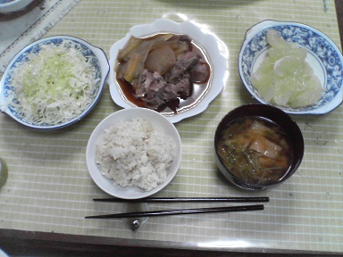 今日は豚肉などを頂きます。豚肉を玉葱と長葱と一緒に煮込んだもの・・味噌汁は豆苗とあぶらげ・・キャベツサラダも頂きます。グレープフルーツも・・今日もおいしく頂きました。