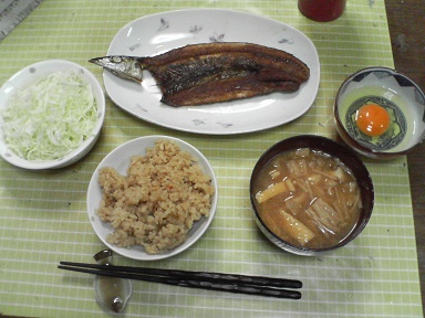 今日はサンマなどを頂きます。オリーブ油で焼いたサンマの開き・・卵も頂きます。今日は炊き込みご飯、味噌汁はエノキとあぶらげ・・キャベツサラダも頂きます。今日もおいしく頂きました。