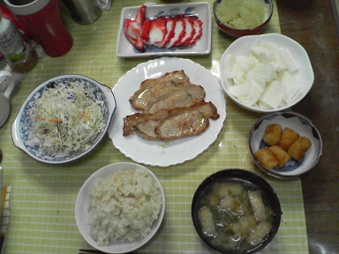 今日は豚肉などを頂きます。素焼きの豚肉、焼き肉のタレで頂きます。酢蛸が余っていたので頂きます。ポテトフライ・・山芋も頂きます。味噌汁は豆苗とあぶらげ・・キャベツサラダも頂きます。グレープフルーツも・・今日もおいしく頂きました。