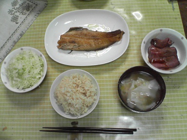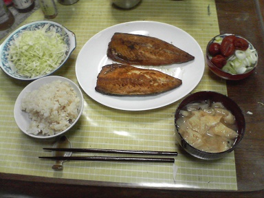 今日は鯖などを頂きます。フライパンにオリーブ油を入れ、塩鯖を焼きます。完成。味噌汁はキャベツとシメジとあぶらげ・・ネギと梅干、薬味??キャベツサラダも頂きます。今日もおいしく頂きました。