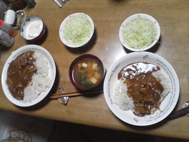 今日はカレーなどを頂きます。普通のポークカレー・・豆腐も頂きます。味噌汁は豆腐とワカメ、キャベツサラダも頂きます。今日もおいしく頂きました。