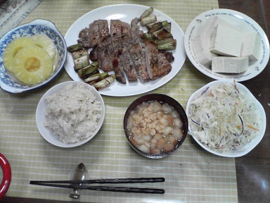 今日は豚肉などを頂きます。フライパンにオリーブ油を入れ、豚肉を焼きます。完成。味噌汁は大根とあぶらげ・・キャベツサラダも頂きます。パイナップルも・・今日もおいしく頂きました。