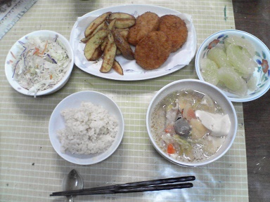 今日は揚物などを頂きます。コロッケとポテト、今日は豚汁・・キャベツサラダも頂きます。グレープフルーツも・・今日もおいしく頂きました。