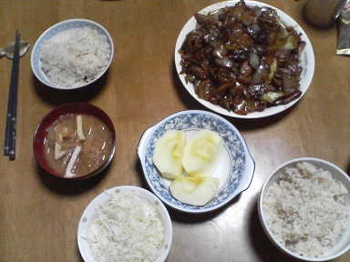 今日はホルモン炒めなどを頂きます。フライパンにオリーブ油を入れ、豚ホルモン、玉葱、長葱、スライスニンニクなどを炒めます。オイスターソース、焼き肉のたれなどで味付けして完成。味噌汁は大根とあぶらげ・・キャベツサラダも頂きます。リンゴも・・今日もおいしく頂きました。