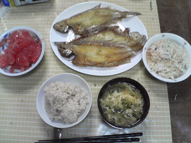 今日はカレイなどを頂きます。オリーブ油で焼いたカレイの一夜干し・・豆苗と卵のスープ・・キャベツサラダも頂きます。グレープフルーツも・・今日もおいしく頂きました。