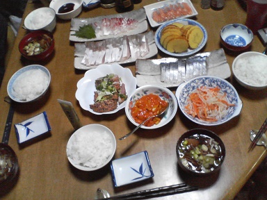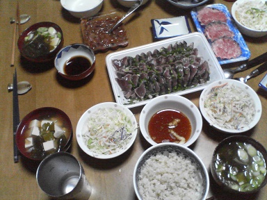 今日はカツオなどを頂きます。カツオのたたき・・ネギトロも頂きます。イカの塩辛も・・ナスの漬物・・味噌汁は豆腐とワカメ、キャベツサラダも頂きます。今日もおいしく頂きました。