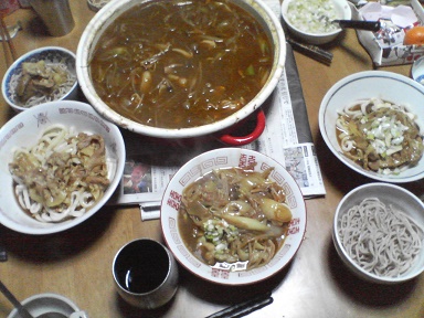 今日はカレーうどんなどを頂きます。前回の鍋うどんを流用、、豚肉、玉葱、長葱などを加え、カレールーを加えて煮込みます。完成。こちらはカレーそば・・今日もおいしく頂きました。