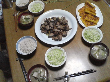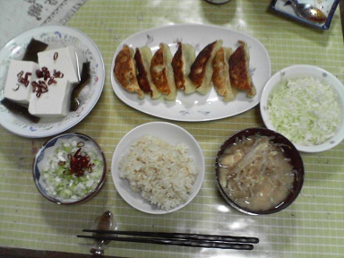 今日は餃子などを頂きます。普通の餃子?豆腐も頂きます。ネギの薬味・・味噌汁はモヤシと卵、キャベツサラダも頂きます。今日もおいしく頂きました。