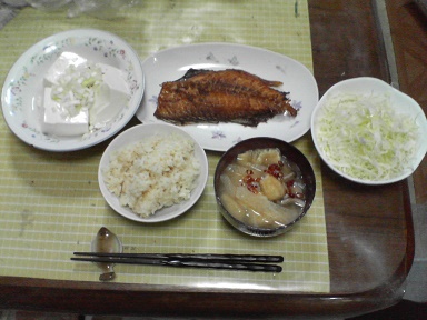 今日は赤魚などを頂きます。オリーブ油で焼いた赤魚、少々焦げ気味・・豆腐も頂きます。味噌汁は大根とあぶらげ・・キャベツサラダも頂きます。今日もおいしく頂きました。