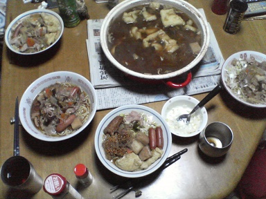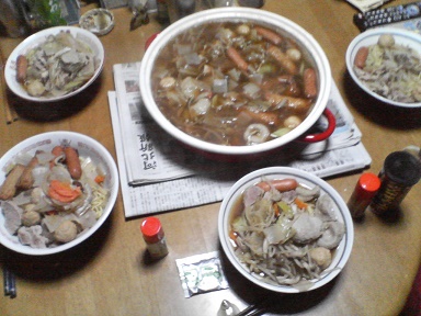 今日も鍋物などを頂きます。2日目・・あぶらげなどを追加、一部の具は味が染みて色も濃くなっています。各自取り分けて頂きます。今日もおいしく頂きました。