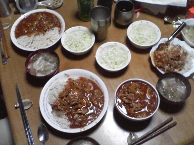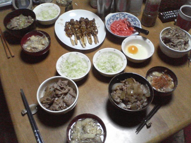 今日は豚丼などを頂きます。フライパンにオリーブ油を入れ、豚肉、玉葱、シメジなどを炒めます。火が通ったら、焼肉のタレと味醂などで味付けします。完成。トッピングの紅生姜と卵を用意・・焼き鳥も頂きます。味噌汁はモヤシとあぶらげ・・キャベツサラダも頂きます。今日もおいしく頂きました。