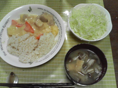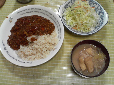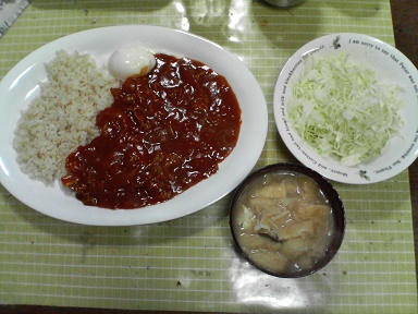 今日はカレーなどを頂きます。キーマカレーみたいなもの?味噌汁は白菜とあぶらげ・・キャベツサラダも頂きます。今日もおいしく頂きました。