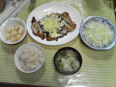 今日はカツオなどを頂きます。タタキ用のカツオをオリーブ油で焼き、醤油などで味付けしたもの・・玉子焼きらしきもの?味噌汁は豆苗と揚豆腐・・キャベツサラダも頂きます。今日もおいしく頂きました。