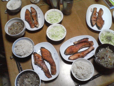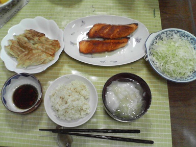 今日はシャケなどを頂きます。オリーブ油で焼いたシャケ・・餃子も頂きます。ワンタンスープ、キャベツサラダも頂きます。今日もおいしく頂きました。