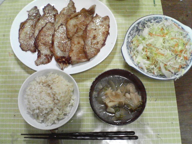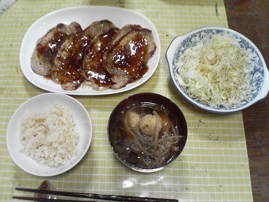 今日は豚肉などを頂きます。オリーブ油で焼いた豚肉・・味噌汁はキャベツとシメジとあぶらげ、キャベツサラダも頂きます。今日もおいしく頂きました。