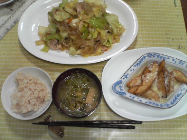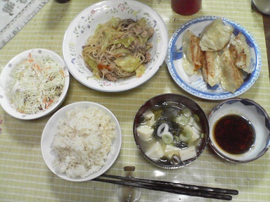 今日はビーフンなどを頂きます。豚肉とキャベツなどと炒めたビーフン・・餃子も頂きます。味噌汁は豆腐とワカメとネギ・・キャベツサラダも頂きます。今日もおいしく頂きました。