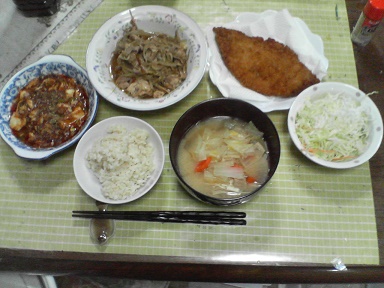 今日はモヤシ炒めなどを頂きます。モヤシと豚肉を市販の素で炒めたもの・・麻婆豆腐も頂きます。白身フライも・・味噌汁は豚汁風?キャベツサラダも頂きます。今日もおいしく頂きました。