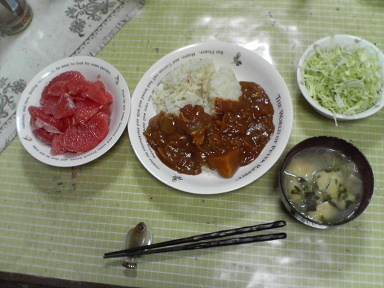 きょうはカレーなどを頂きます。ポークカレー・・味噌汁は豆苗とあぶらげ、キャベツサラダも頂きます。グレープフルーツも・・今日もおいしく頂きました。