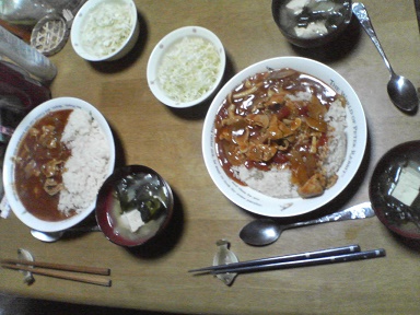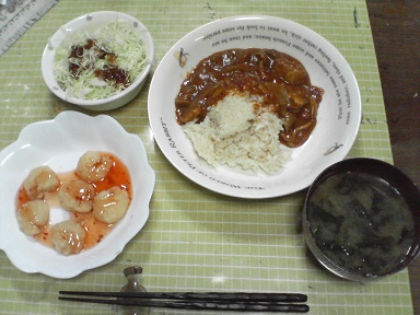 今日はハヤシライスなどを頂きます。普通のハヤシライス・・エビチリもどき?小エビの天ぷらにチリソースをかけたもの・・味噌汁はワカメ・・キャベツサラダも頂きます。今日もおいしく頂きました。
