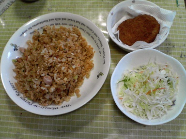 今日は炒飯などを頂きます。あり合わせの材料で作った炒飯・・おかずはコロッケ、キャベツサラダも頂きます。今日もおいしく頂きました。