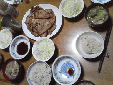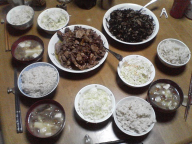 今日は豚肉などを頂きます。フライパンにオリーブ油を入れ、豚肉を炒めます。火が通ったら焼き肉のタレと味醂などで甘めに味付けします。完成。ひじきも頂きます。味噌汁はナメコと豆腐とネギ・・キャベツサラダも頂きます。今日もおいしく頂きました。