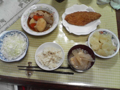 今日は肉じゃがなどを頂きます。普通の肉じゃが?白身魚のフライも頂きます。味噌汁は大根とあぶらげ・・キャベツサラダも頂きます。グレープフルーツも・・今日もおいしく頂きました。