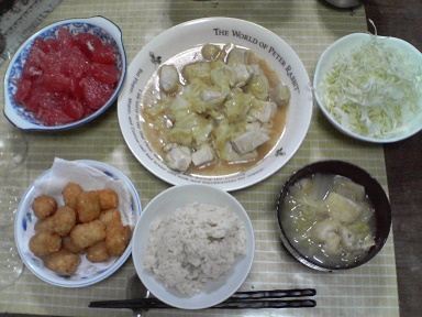 今日は鶏などを頂きます。鶏肉とキャベツを煮込んだもの・・ポテトも頂きます。味噌汁は白菜とあぶらげ、キャベツサラダも頂きます。グレープフルーツも・・今日もおいしく頂きました。