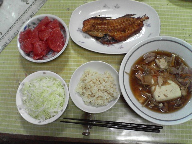 今日は赤魚などを頂きます。オリーブ油で焼いた赤魚、味噌汁は代わりに前回の鍋物の余りを流用・・キャベツサラダも頂きます。グレープフルーツも・・今日もおいしく頂きました。