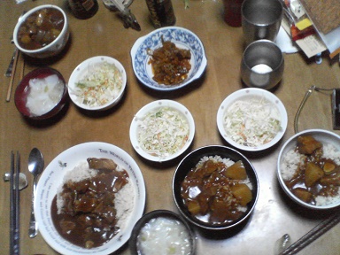 今日はカレーなどを頂きます。ポークカレー・・福神漬も・・ワンタンスープ、キャベツサラダも頂きます。今日もおいしく頂きました。
