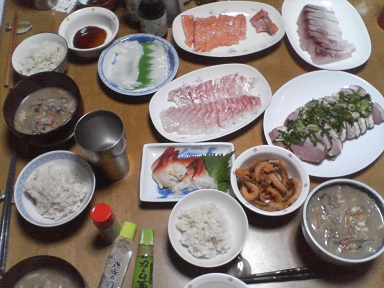 あけましておめでとうございます。とりあえず正月向きのおかずなどを頂きます。普通の刺身各種?合鴨のハム・・イカリングも頂きます。雑煮みたいなもの?今日もおいしく頂きました。